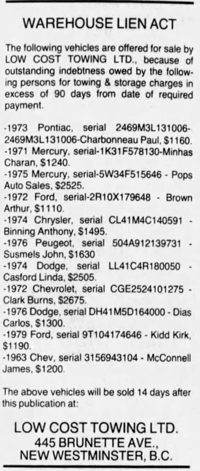 Photo Serial # Series Model Year Body Style Last Known Location Province/State